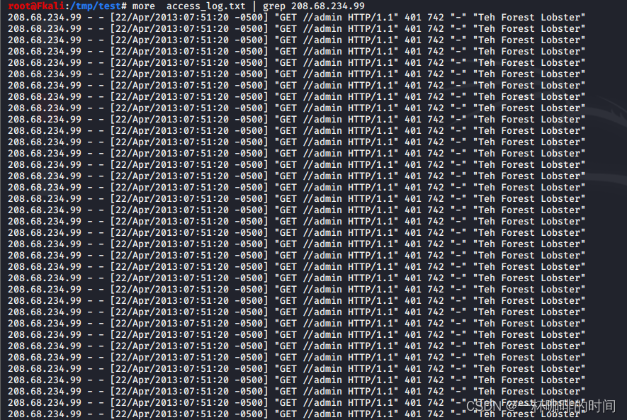 208.68.234.99 - - [22/Apr/2013:07:51:20 -0500] "GET //admin HTTP/1.1" 401 742 "-" "Teh Forest Lobster"