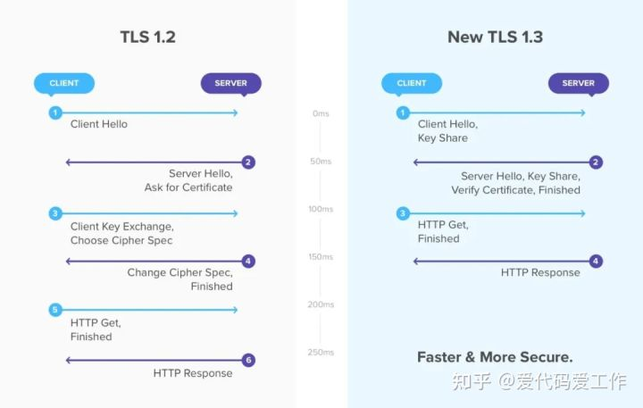 从TLSv1.2升级到TLSv1.3,只需要 1-RTT 就能完成 TLS 握手,而TLSv1.2 握手过程需要经过 2-RTT 才能完成握手(下面两个交互图最后两条交互是请求报文和响应,不归属与TLS)