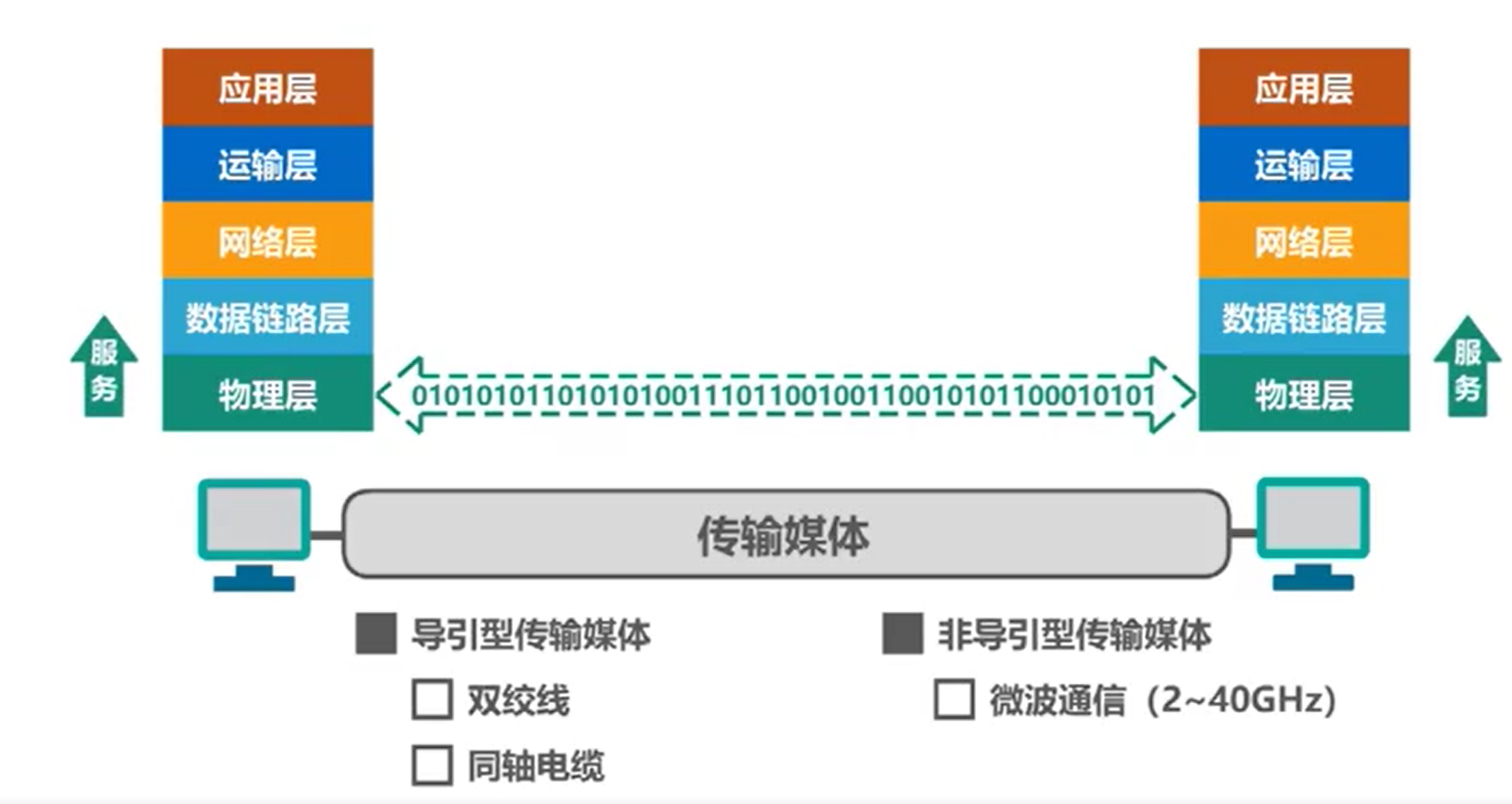 物理层:绿色双向箭头,物理层主要是两台机器之间用什么介质传导数据,就像图片中两台电脑的传输媒体介质可以有多种 数据链路层:绿色双向箭头中的01010101…,机器只能识别0和1,数据链路主要是把需要传输的数据包根据某种规则分组生成0和1,这些0和1在物理层传输,在另一端的数据链路层把这些0和1根据某种规则转成数据包