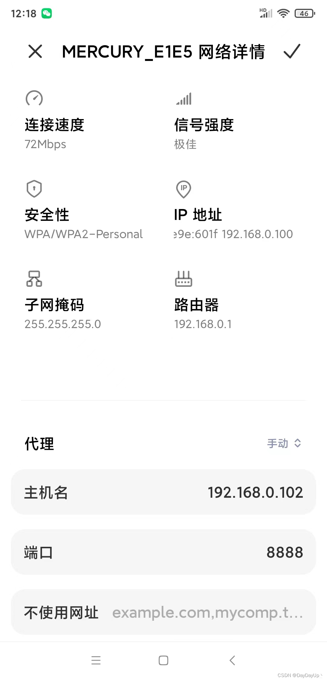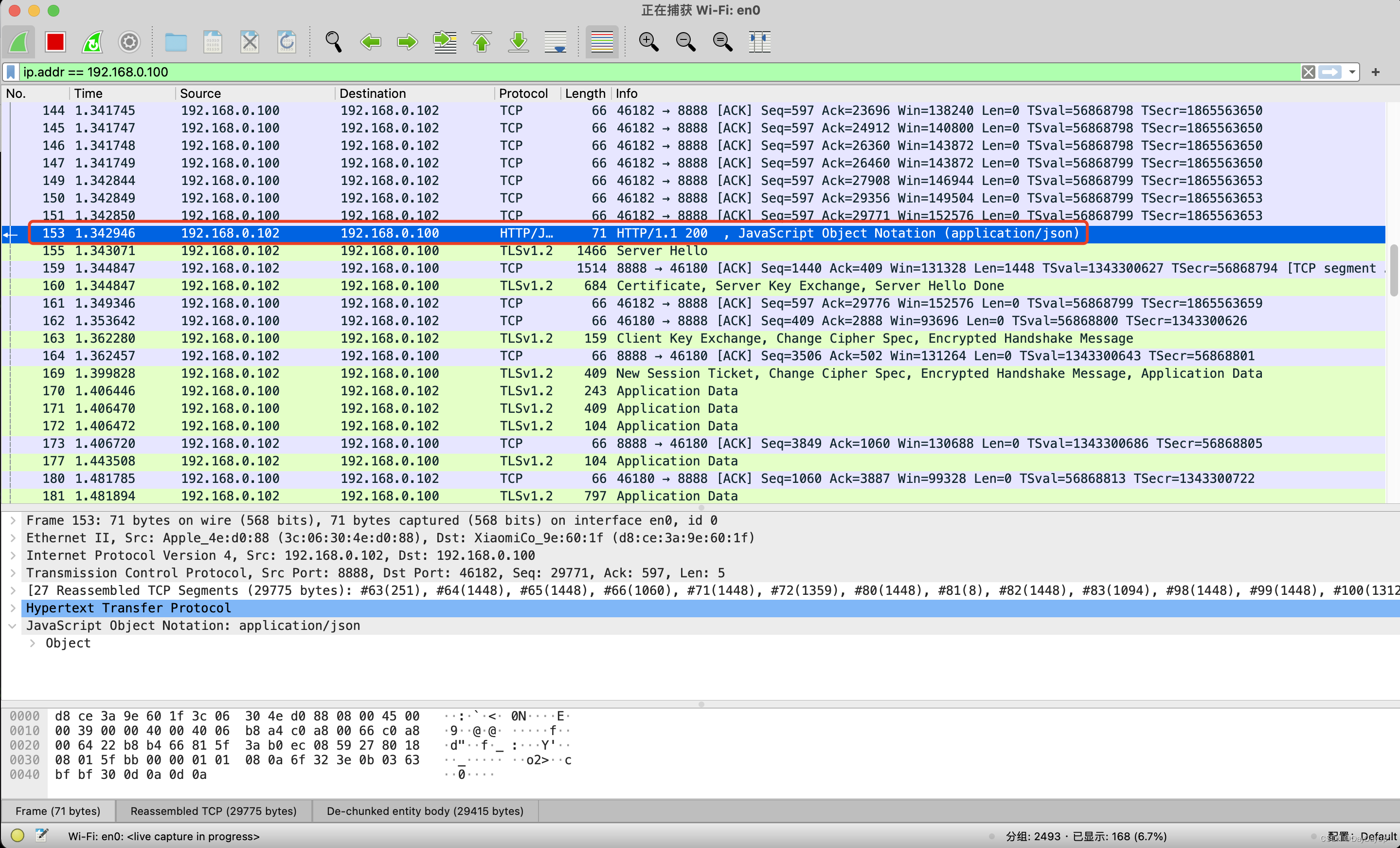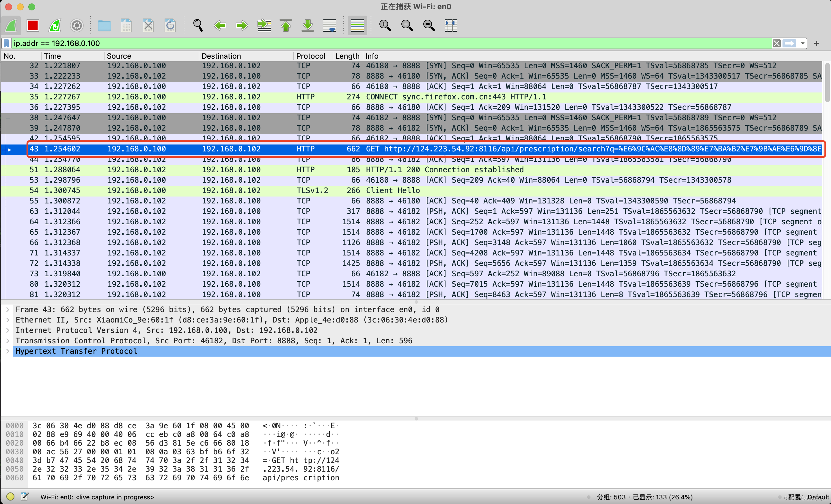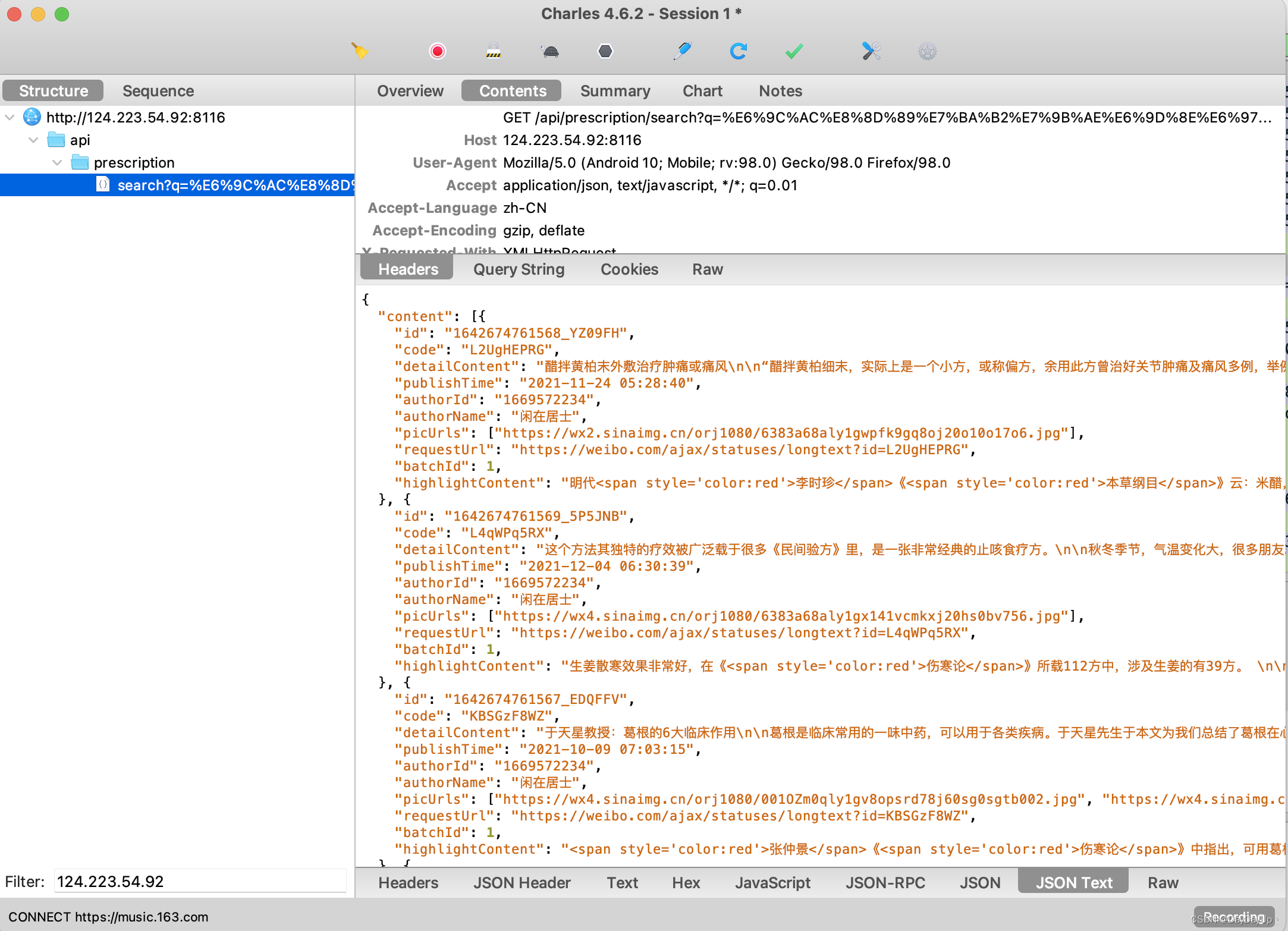 这里使用第二种方式,第一步,下载安装好Charles 后,设置Proxy->Proxy Settings->HTTP Proxy 的Port=8888,如下,  第二步,手机连到跟PC同一个WIFI下,在所连WIFI中设置代理主机名为PC的ip,代理端口为Charles设置的8888,如下,  这样设置代理后,手机的流量就跑去PC代理了,不再是直接发送到路由器。 上图已经可以得知手机的ip是192.168.0.100,所以在Wireshark设置过滤器ip.addr == 192.168.0.100 ,并开始捕获。 接着同样打开手机浏览器访问http://124.223.54.92:8116/,并搜索,  再回到Wireshark查看是否已经捕获到信息,如下No=43,捕获到了请求,  如下No=153,也捕获到了响应,  同样,Charles 本身作为与Wireshark同类工具,也同时获取到了该请求及响应,如下,