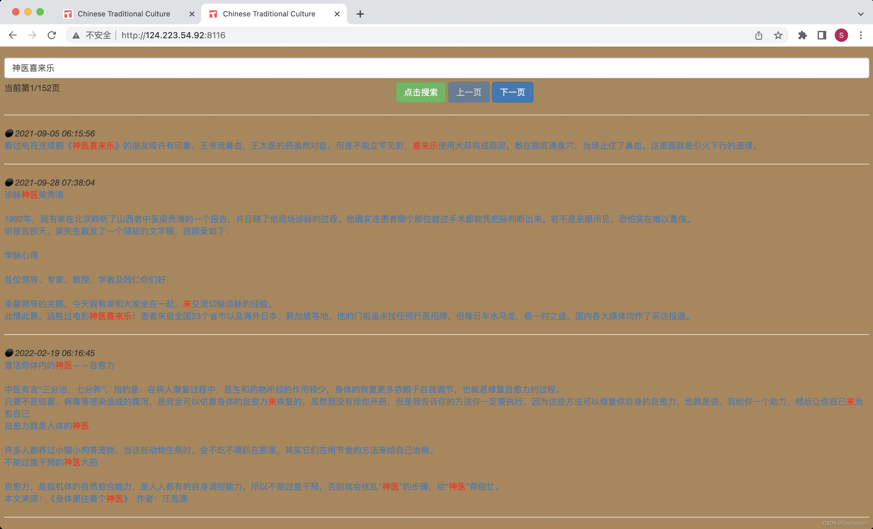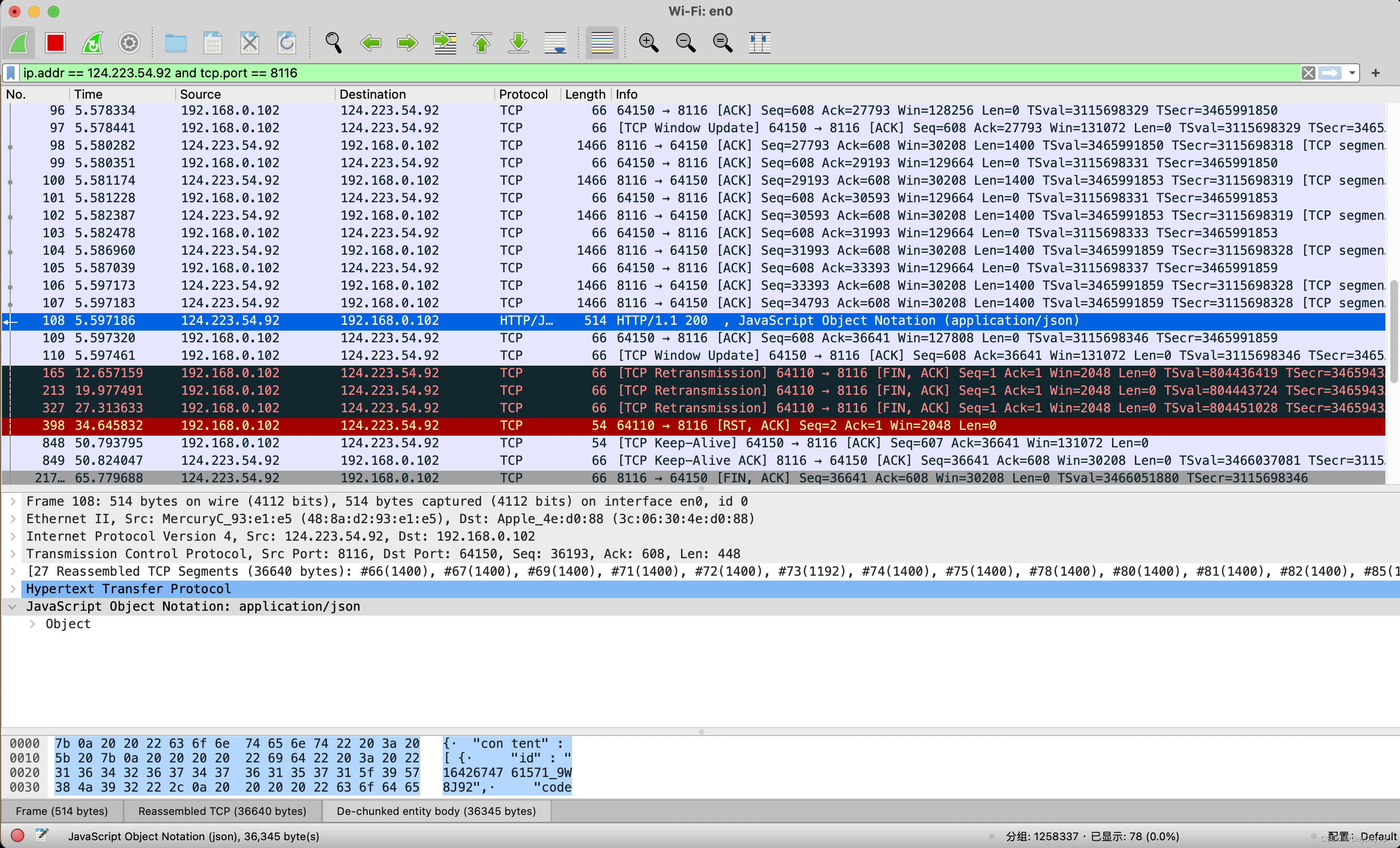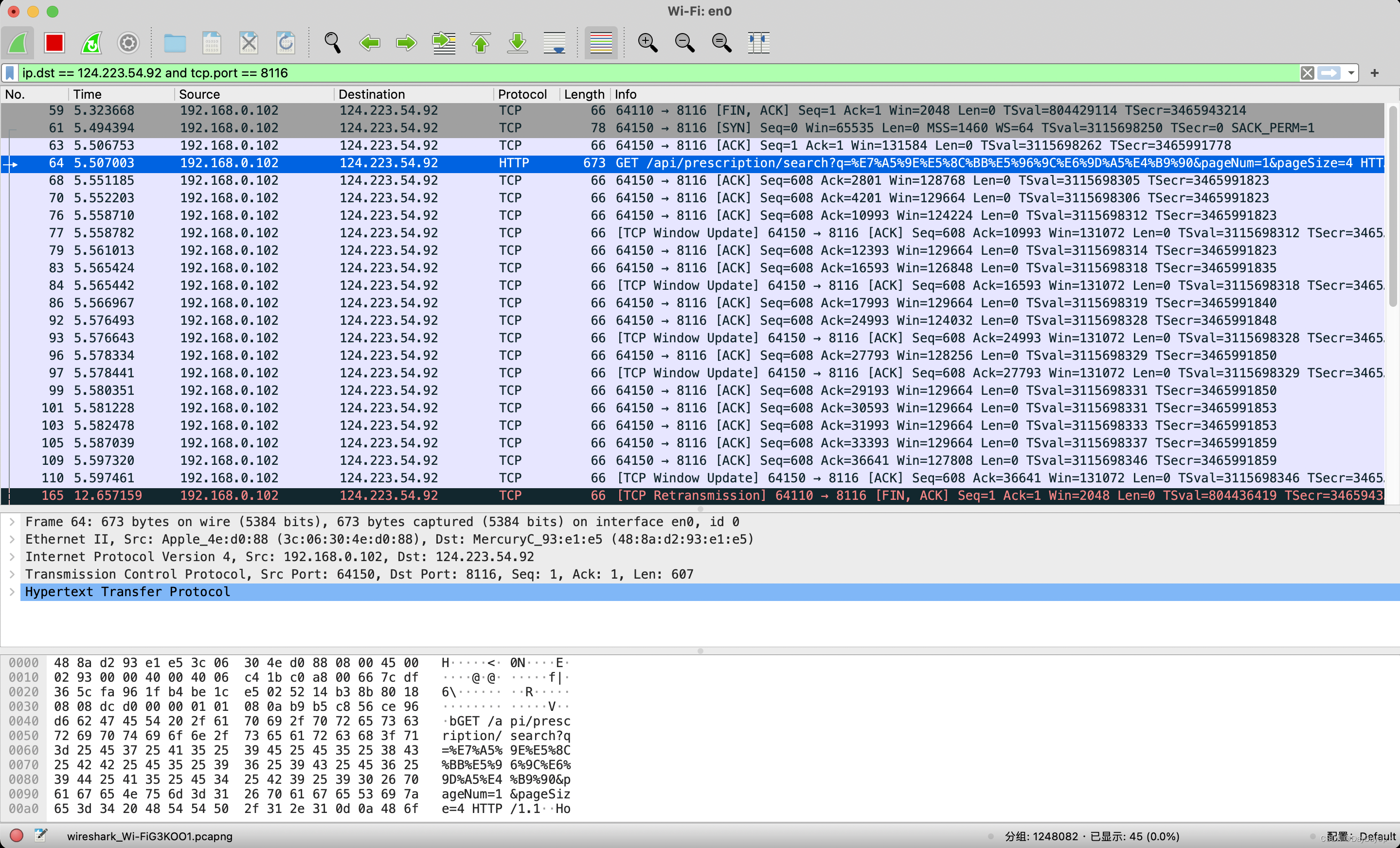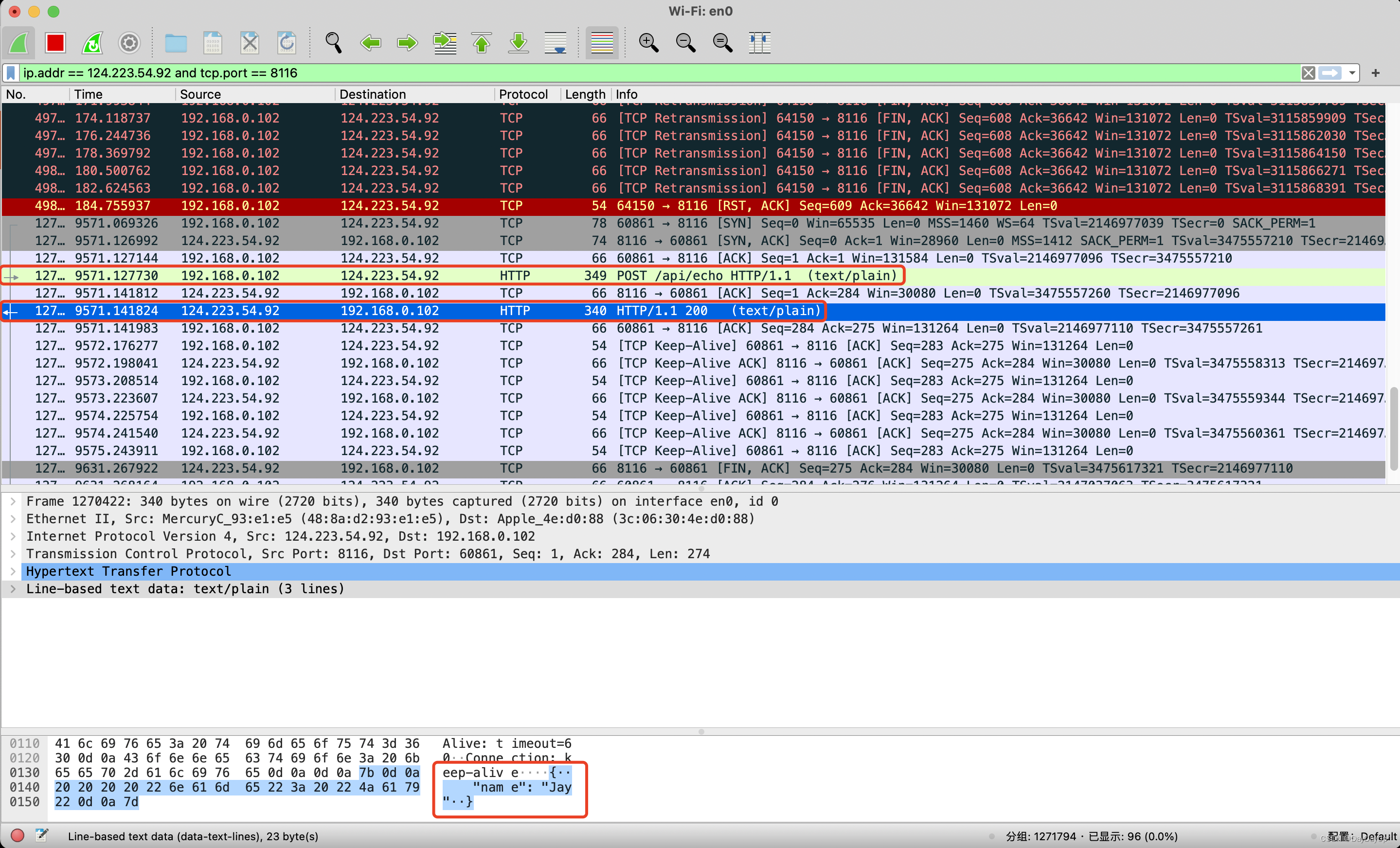 首先设置Wireshark过滤器ip.dst == 124.223.54.92 and tcp.port == 8116 ,开始捕获。 然后打开PC(本地IP:192.168.0.102)的浏览器,访问一个自己练手的的中医药信息网站:http://124.223.54.92:8116/,并搜索“神医喜来乐”,  如上搜索到一些相关结果,再来查看Wireshark捕获的内容,  只能看到浏览器->服务器的单向请求(No=64,左侧箭头→ 代表src->dst即客户端192.168.0.102->服务端124.223.54.92的请求),捕获不到相应数据。 如果想拿到响应,下面将过滤器改为ip.addr == 124.223.54.92 and tcp.port == 8116 (ip.addr代表src或dst都可以是这个ip),应用新过滤器后查看捕获结果如下,  No=108,左侧箭头← 代表source->dest即服务端124.223.54.92->客户端192.168.0.102的响应。 前面的搜索请求是GET请求,接着再试一下POST请求http://124.223.54.92:8116/api/echo,这个echo接口请求体传什么响应就返回什么,如下,