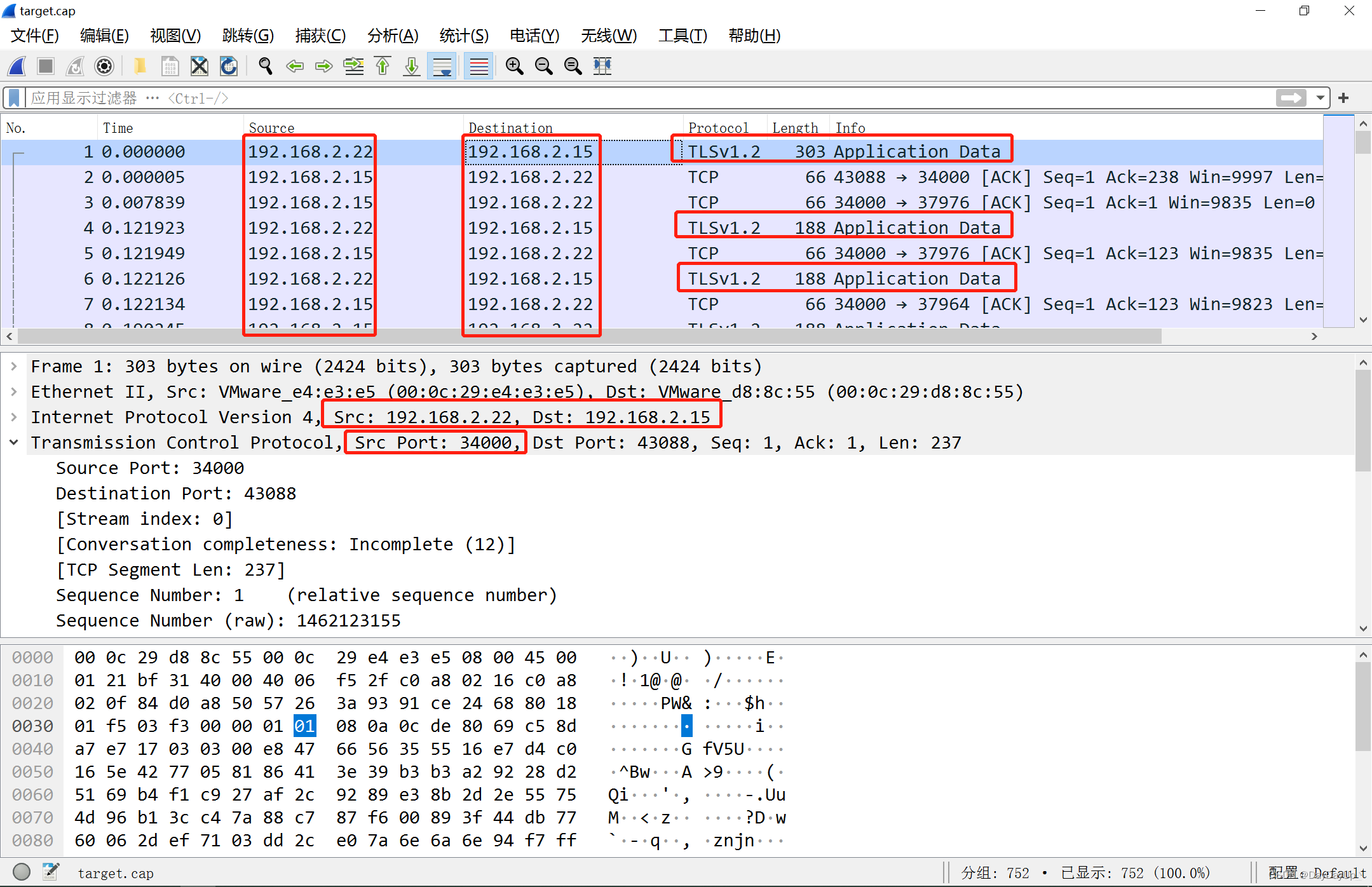 第二步,将cap文件放到本地PC,并导入Wireshark分析,如下,可以看到两个进程之间的p2p握手协议是TLSv1.2加密的,报文内容也是显示为Application Data,代表被加密。