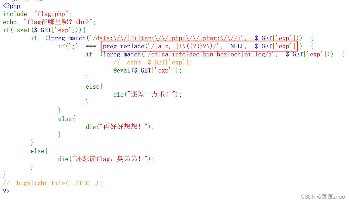 - GET方式传入exp参数,若满足条件,则将exp内容当做php代码来执行。
