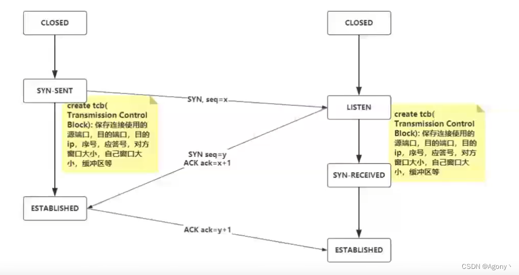 1.TCP 连接:四元组[源地址,源端口, 目的地址,目的端口 ] 2.确立连接: TCP 三次握手 a.同步通信双方初始序列号( ISN, initial sequence number ) b.协商 TCP 通信参数(MSS, 窗口信息,指定校验和算法)