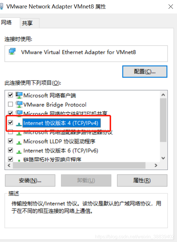 step4:设置宿主机网卡配置,进入到VMnet8,设置IPv4属性,就是把刚才让你记住的子网掩码和网关配置在这里,IP设置一个局域网中没有使用的,(切记,这里配置的网段跟虚拟机必须是同一局域网)