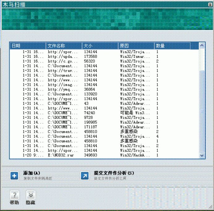 选择查看可疑文件功能,可疑文件不认定为安全文件但是又不能认定为病毒,在计算机的病毒敏感部位活动,而又没有太大的作用的文件都会被系统列为可疑文件,如下图所示: