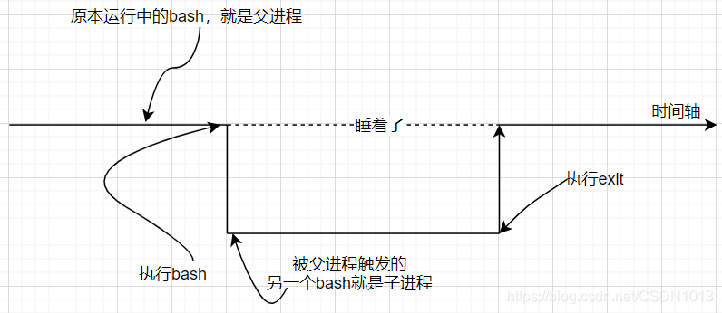 在原本运行的bash中执行另一个bash,操作的环境就会跑到第二个bash里面去,原本的bash会处于sleep状态。实线是整个命令的运行环境。当第二个bash结束后,会返回到原本的bash中去。