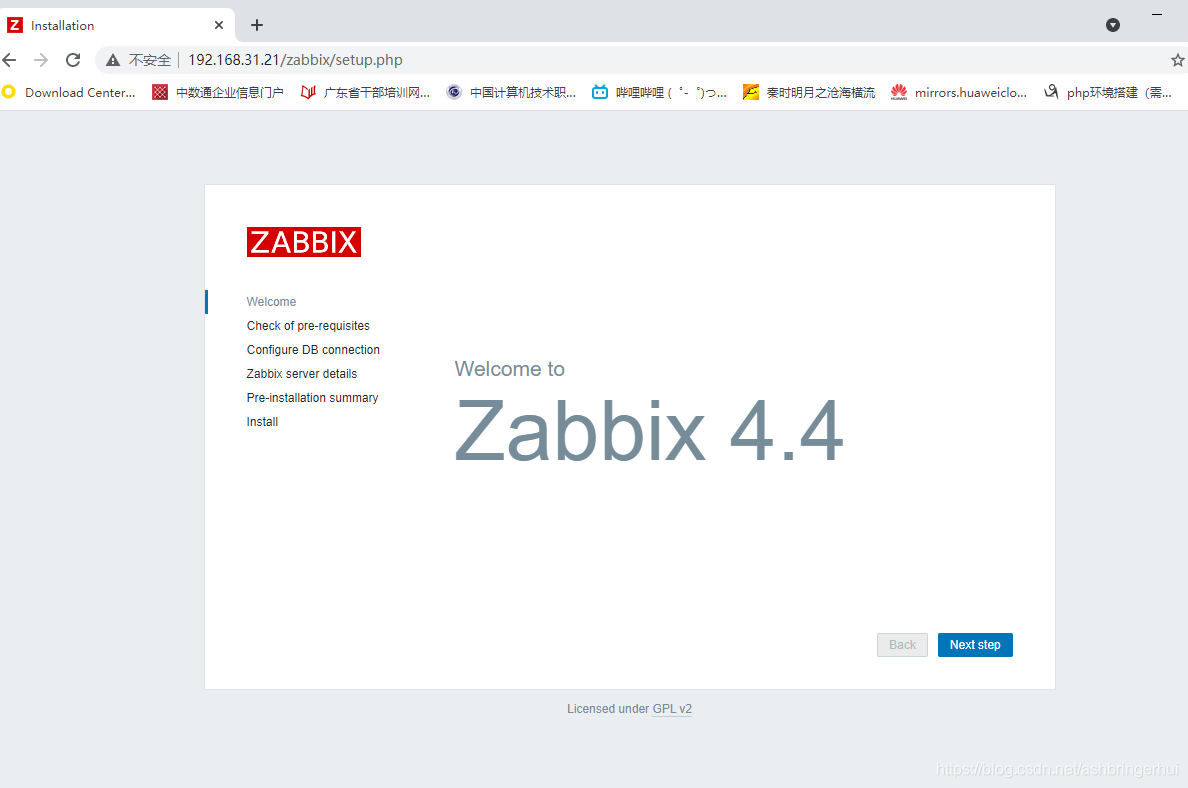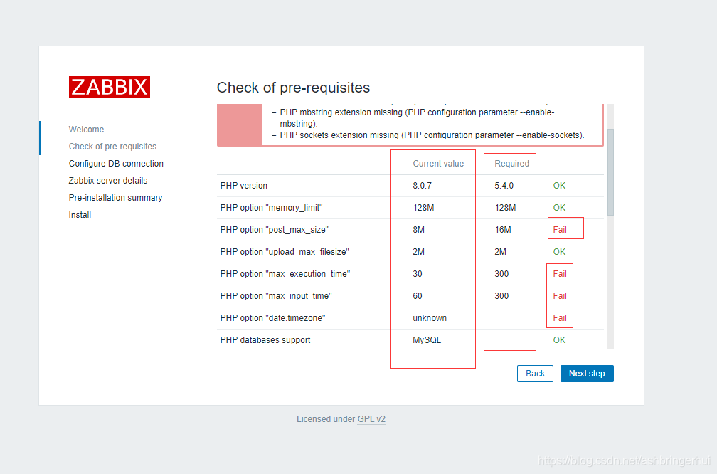 next step后,页面出现一些报错,需要解决的,如果开少了模块需要重新开启模块并重新安装(此步略,上面的编译已把少开的模块加上了),接下来我们先解决一下配置上面的问题
