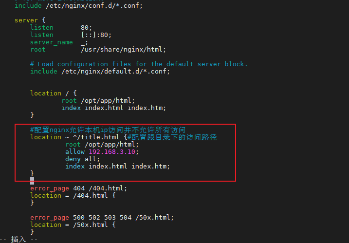 编辑nginx.conf配置文件,在http块的server块中配置允许本机ip访问并配置不允许所有访问,添加如下内容 #配置nginx允许本机ip访问并不允许所有访问