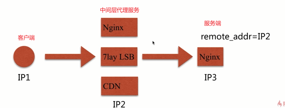 - 如上图,如果访问不是客户端与服务端直接连接,而是通过一层代理。【包括nginx代理、7lay LSB(7层的负载均衡)、CDN代理】,nginx是通过remote_addr = IP2这个变量来识别客户端的ip;
