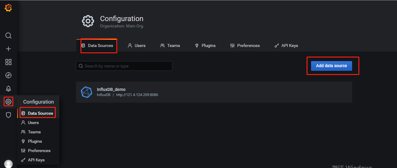 成功登陆后,添加数据源,我们这里选择influxDB。我这已经创建成功了一个名为influxDB_demo的数据源了