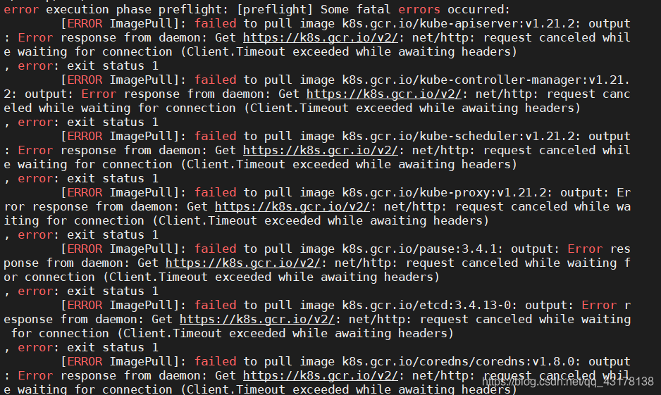 [ERROR ImagePull]: failed to pull image k8s.gcr.io/kube-controller-manager:v1.21. 2: output: Error response from daemon: Get https://k8s.gcr.io/v2/: net/http: request canc eled while waiting for connection (Client.Timeout exceeded while awaiting headers)