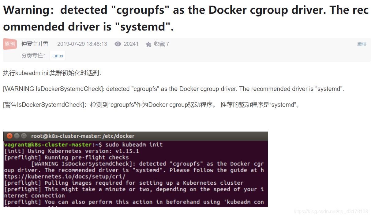 [WARNING IsDockerSystemdCheck]: detected "cgroupfs" as the Docker cgroup driver. The recommended driver is "systemd". Please follow the guide at https://kubernetes.io/doc s/setup/cri/