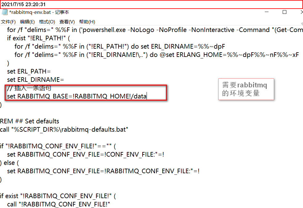 rabbitmq-server.bat 不要直接点击bat文件,因为bat默认文件路径还没修改,需要修改rabbitmq-env.bat文件,设置默认的数据文件路径 ,具体设置还是参考上面解决方法