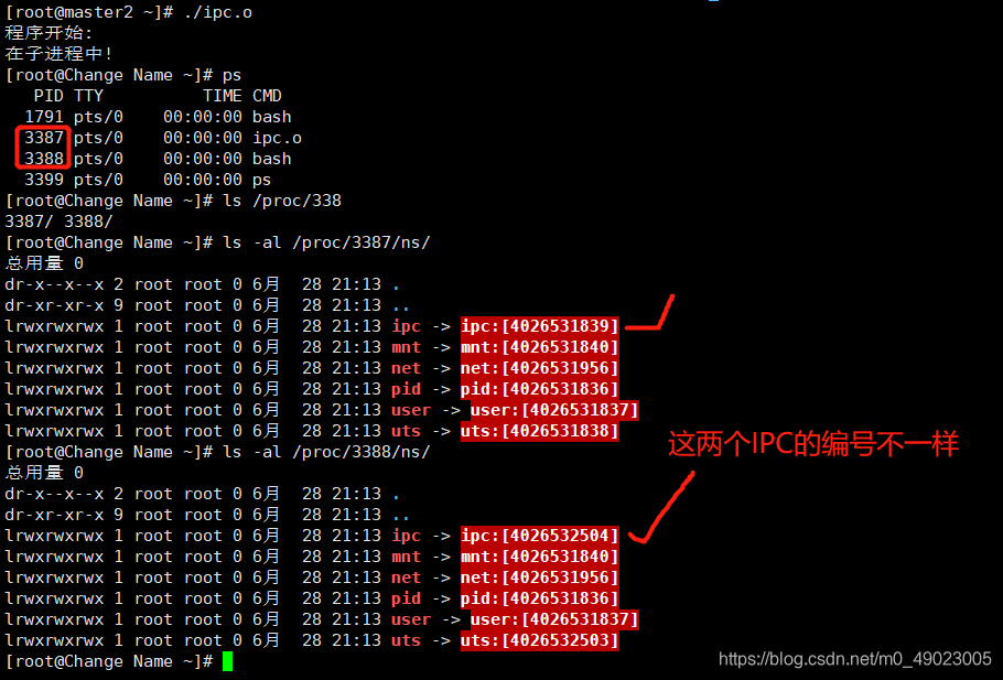 我们在试验的过程中也可以看一下/proc/[PID]/ns/目录下的各个namespace编号