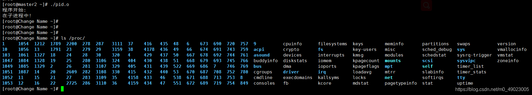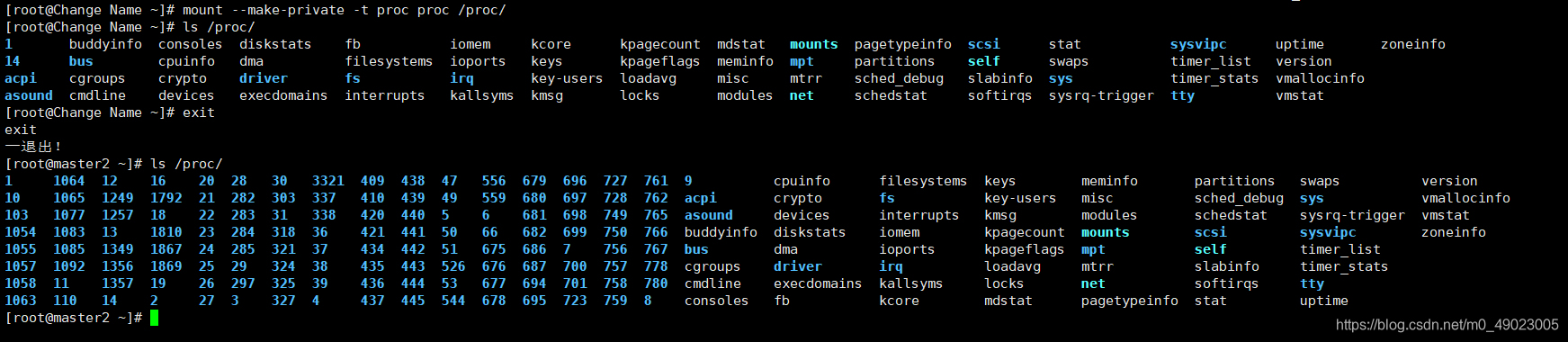 然后在去子进程中执行挂载命令,也就是说,在子进程中执行mount命令之前,必须先把发进程的proc目录挂载了。