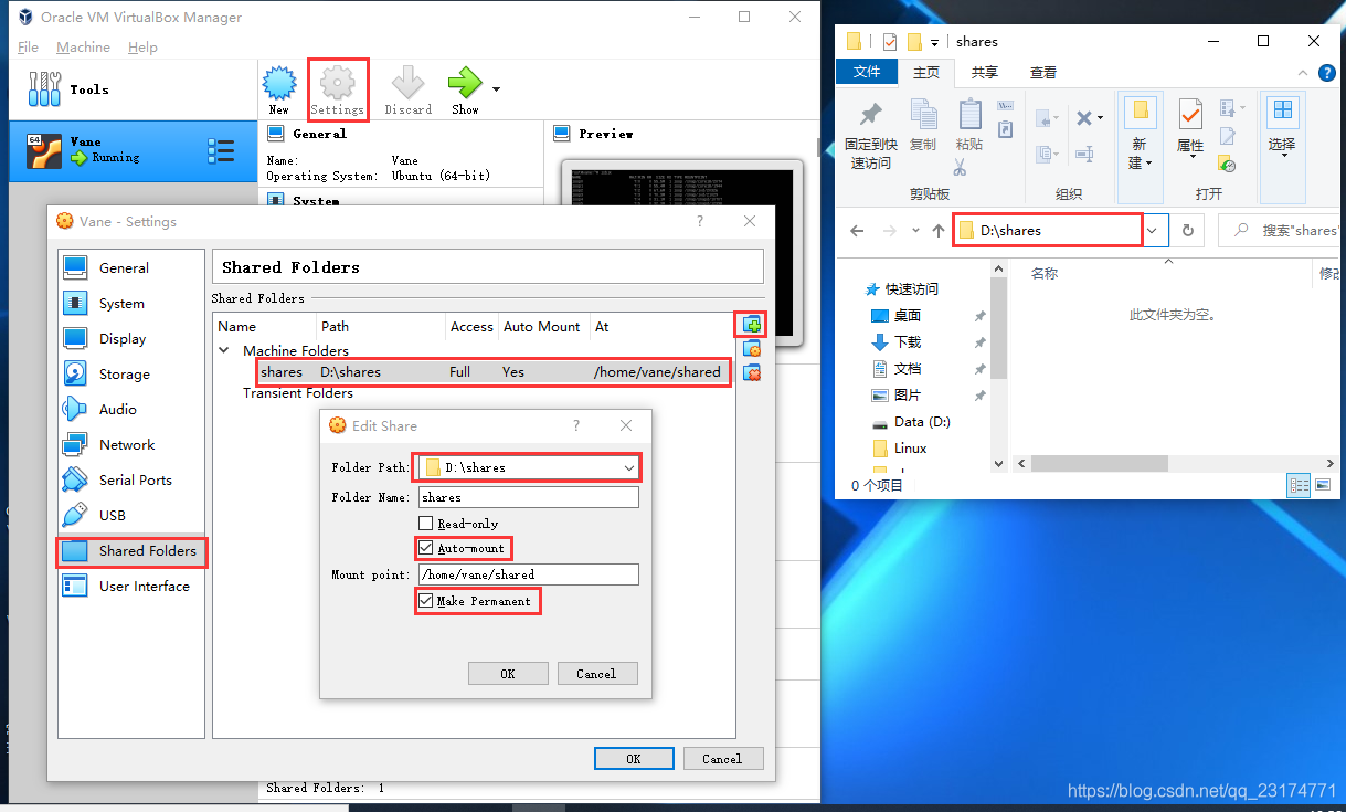 3.安装VBoxLinuxAdditions.run (1)首先安装相关的依赖包 ①安装gcc编译器:apt install gcc ②更新linux header:apt install linux-headers-$(uname -r) ③安装build-essential软件包:apt install build-essential (2)运行命令:./VBoxLinuxAdditions.run 4.设置共享目录 (1)在宿主机下建立文件夹 (2)在virtualBox6.1中配置共享文件夹 (3)在虚拟机中输入挂在命令:mount -t vboxsf shares /home/uname/shared 说明: ①其中"uname"是账号名 ②其中"shares"是宿主机下的共享文件夹名称 ③其中"/home/uname/shared"是虚拟机下的共享文件夹路径