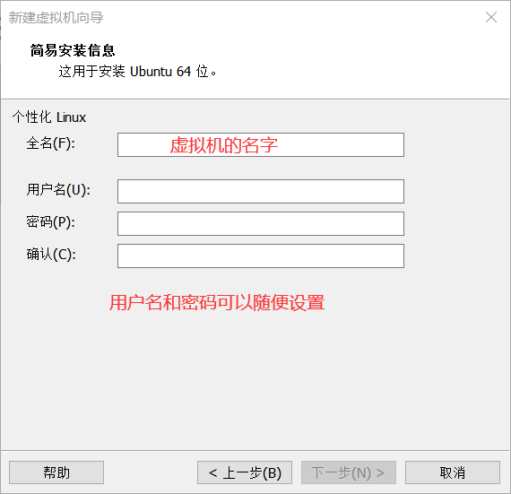 ?(5)设置虚拟机的名字和用户名、密码,点击“下一步”。