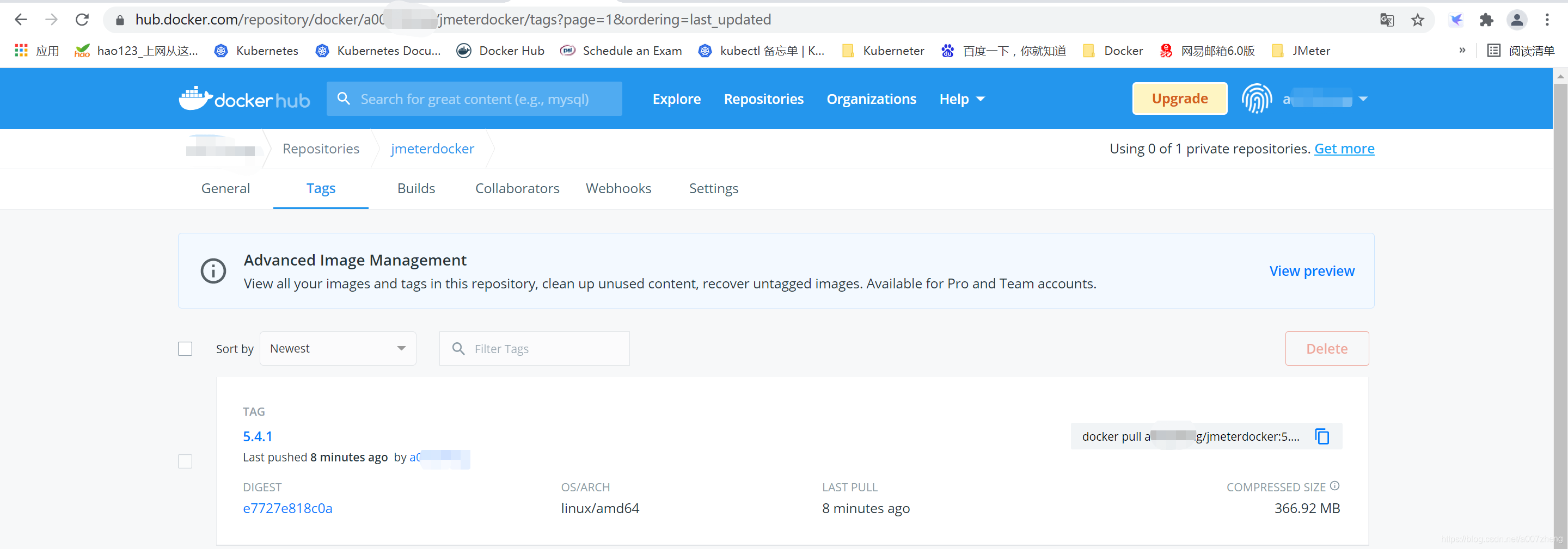 将制作好的镜像 push 到docker hub中,?命令:docker push XXX/jmeterdocker:5.4.1??这个5.4.1其实是一个tag name 会在dcoker?hub的Tags那里显示。