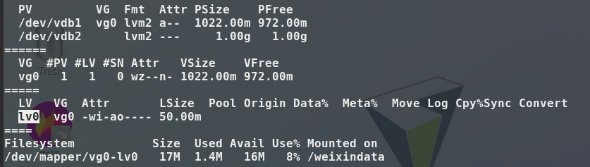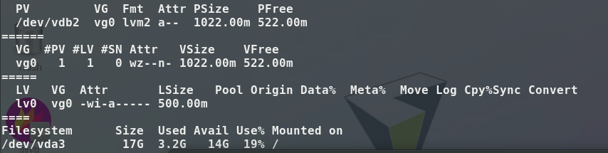 实验步骤 lvm设备建立 建立物理分区并设定分区 pvcreate /dev/vdb1?? ????????????? ##创建pv 1 vgcreate vg0 /dev/vdb1?? ??? ?? ##创建vg 0 ?? ?vgdispaly?? ??? ??? ?????????????????? ##显示vg ?? ?vgremove vg0?? ??? ????????????? ##移除vg0 vgcreate -s 2M vg0 /dev/vdb1?? ?##设置pe为2M的vg0 lvcreate -L 22M -n lv0? vg0?? ?##设置lv0为22M L 容量大小 l容量个数