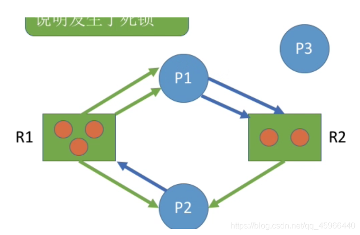 - 进程推进顺序非法。请求和释放资源的顺序不当,也同样会导致死锁。例如,并发执行的进程P1、P2分别申请并占有了资源R1、R2,之后进程p1又紧接着申请资源R2,而进程p2又申请资源R1,两者会因为申请的资源被对方占有而阻塞,从而发生死锁。
