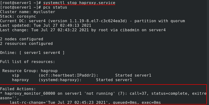 真实主机上准备高可用插件的文件夹  server1修改软件仓库,配置高可用插件地址  安装高可用插件pacemaker  为了操作方便,server1生成免密操作密钥,发送给server4  将server1的仓库配置文件发送给server4  server1连接server4并为其安装相关高可用插件  开启server1和server4的pcsd服务,可以使用pcs命令  修改server1和server4的hacluster认证密码,然后认证  设定集群的名称为mycluster,集群内有server1和server4两个设备  启动集群内所有服务节点  查看状态,会出现如下报错,这个是没有Fencing设备时,没有禁用stonith功能,将其禁用就可以了  pcs property set stonith-enabled=false 禁用stonith功能,现在没有报警  在server4上安装haproxy,并将server1的haproxy配置文件发送给server4   server1和server4启动haproxy负载均衡,查看网络状态可以看到80端口处于监听状态   测试访问  查看pcs支持的脚本和提供者  配置集群管理VIP  可以看到集群状态里已经获取到了VIP信息,测试访问看到服务已经成功启动   在server1中将节点置为后备standby状态,pcs查看集群状态,看到vip现在运行在了server4节点  在server4中删除vip网络接口,因为server1节点已经为后备状态了,所以vip网络接口信息又会自动生成   停止haproxy,会出现下面报错  server1节点取消后备状态  server1和server4关闭haproxy服务 将haproxy添加到集群管理  查看集群状态,可以看到vip运行在server4节点,haproxy运行在server1节点  为了解决不同步的问题,我们将vip和haproxy放入同一个组  现在将server4设为后备状态,可以看到vip和haproxy都运行在了server1节点  取消server4的后备状态,看到vip和haproxy还是运行在server1节点  现在关闭server1的haproxy服务,查看集群运行状态,可以看到haproxy在server1节点的运行出行错误和警告  再次开启haproxy服务,集群运行恢复  再server1中输入命令echo c > /proc/sysrq-trigger ,让系统崩溃  现在再server4上查看集群状态,可以看到vip和haproxy服务都转移到了server4节点,并正常运行