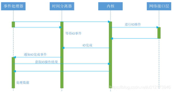 具体流程如下: 1. 处理器发起异步操作,并关注 I/O 完成事件 2. 事件分离器等待操作完成事件 3. 分离器等待过程中,内核并行执行实际的 I/O 操作,并将结果数据存入用户自定义缓冲区,最后通知事件分离器读操作完成 4. I/O 完成后,通过事件分离器呼唤处理器 5. 事件处理器处理用户自定义缓冲区中的数据