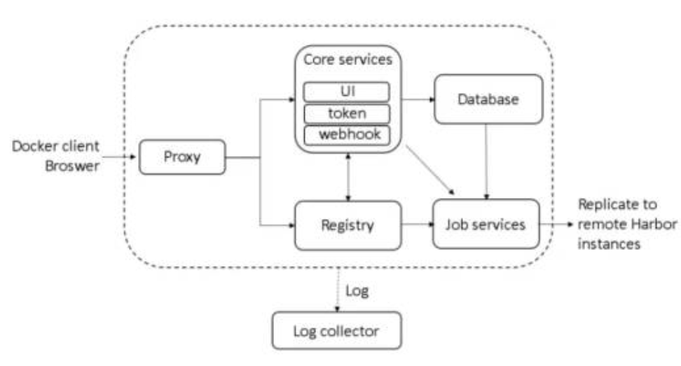 Harbor 在架构上主要有Proxy、 Registry、 Core services、 Database ( Harbor-db) 、Log collector (Harbor-log) 、Job services六个组件。