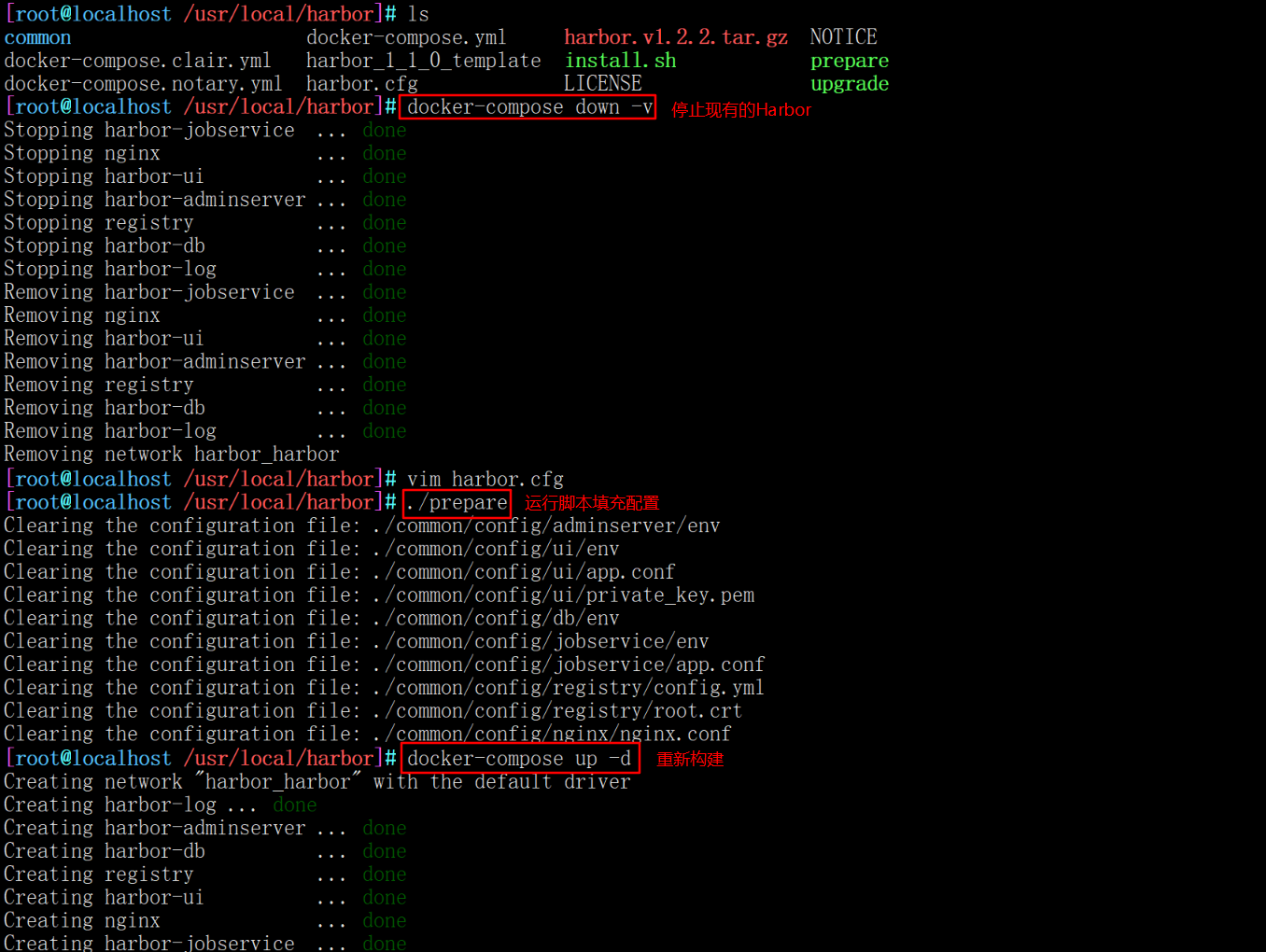 要更改Harbour的配置文件中的可选参数时,请先停止现有的Harbour实例并更新Harbor.cfg; 然后运行prepare脚本来填充配置;