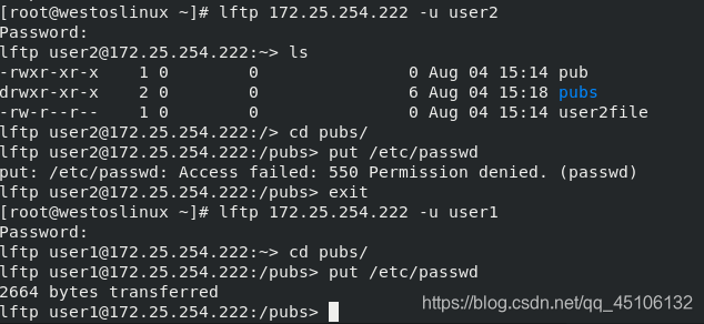 mkdir /etc/vsftpd/westos?? ??? ? vim /etc/vsftpd/westos/user1?? ??? ?##编写user1用户独立配置文件可以上传文件user2 3不可以 ?? ?anon_upload_enable=YES