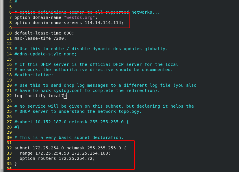 2 找到dhcp服务配置文件 /etc/dhcp/dhcpd.conf,并用模板生成dhcp配置文件内容。