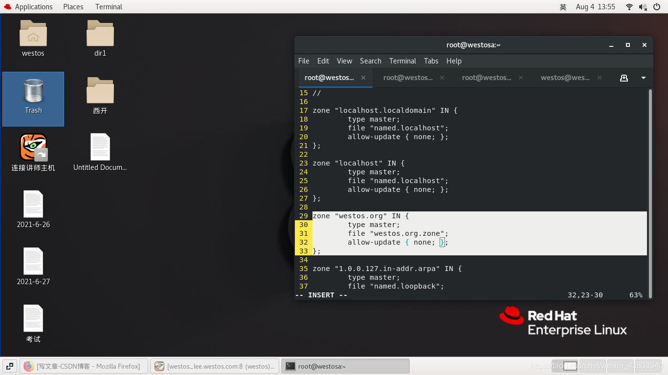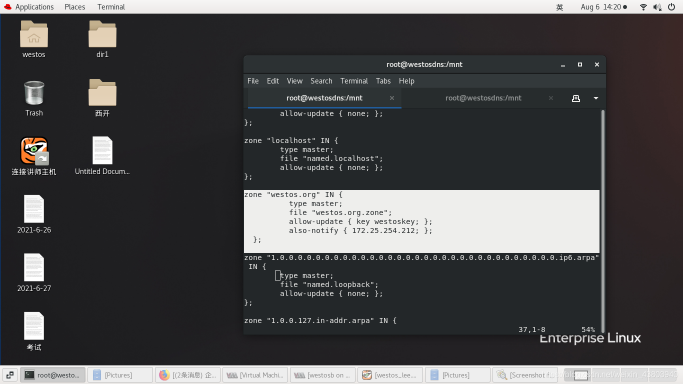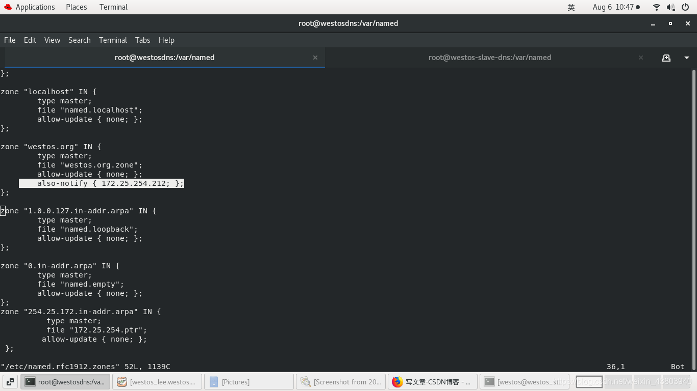 ?zone "westos.org" IN { ????????? type master; ????????? file "westos.org.zone"; ????????? allow-update { key westoskey; }; ????????? also-notify { 172.25.254.212; }; ? };