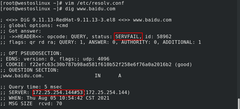 另一台主机dns指向到服务器(172.25.254.144)。但因为服务器不能上网,所以查询失败。