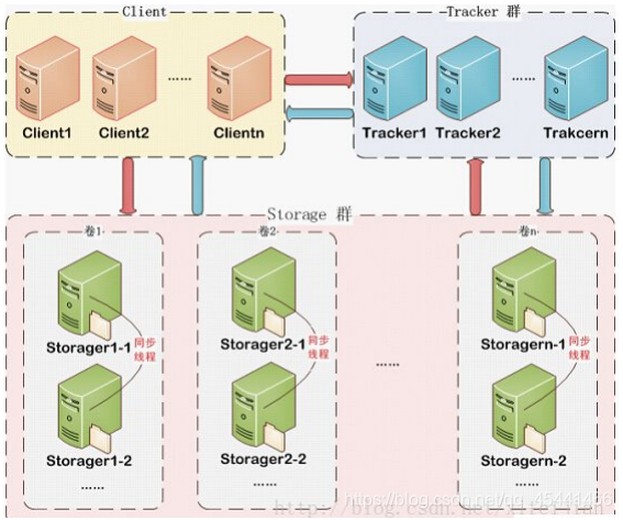 ????????storage集群采用分组的方式,同组内的每台服务器是平等关系,数据同步,目的是实现数据 备份,从而高可用,而不同组的服务器之间是不通信的;