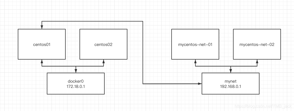 例如我使用docker0 网络运行了两个centos 01 和 centos02 服务,使用了 mynet 运行了 mycentos-net-01 和?mycentos-net-02 服务,现在需要用centos01 和?mycentos-net-02 互通网络,应该如何?