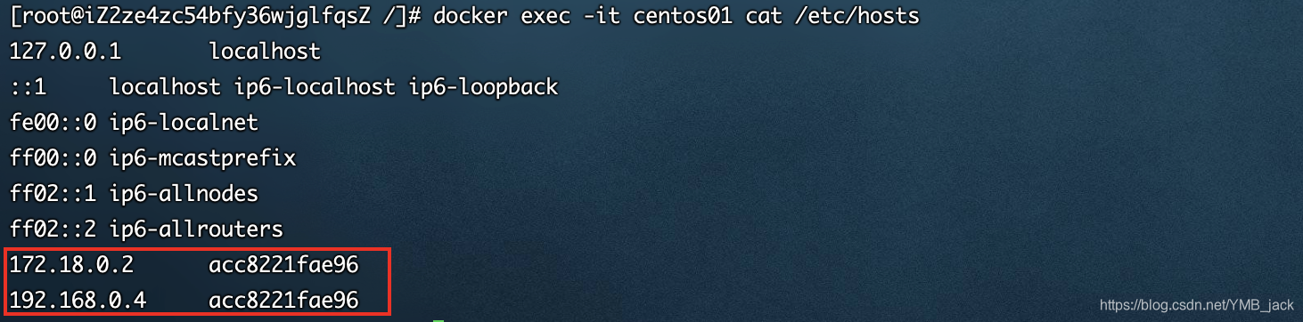 ?我们会发现在 mynet网络中,存在centos01,意思就是 connect 命令后,相当于?centos01网络配置添加到了 mynet中,理解为:阿里云服务器 一个官网ip 一个私网ip地址,那么一个容器 两个IP地址。
