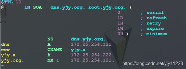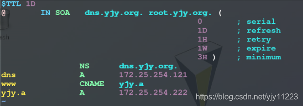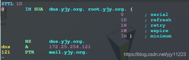vim 172.25.254.ptr $TTL 1D @?? ?IN SOA?? ?dns.westos.org. root.westos.org. ( ?? ??? ??? ??? ??? ?0?? ?? ; serial ?? ??? ??? ??? ??? ?1D?? ?; refresh ?? ??? ??? ??? ??? ?1H?? ?; retry ?? ??? ??? ??? ??? ?1W?? ; expire ?? ??? ??? ??? ??? ?3H )? ; minimum ?? ?NS?? ?dns.westos.org. dns?? ?A?? ?172.25.254.121 121?? ?PTR?? ?mail.westos.org.