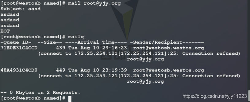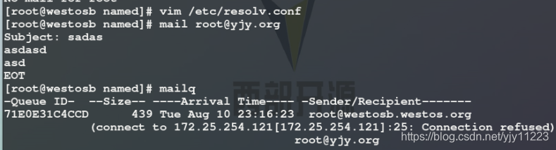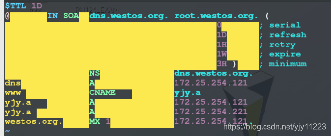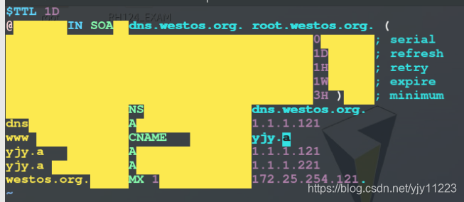配置方式: cd /var/named/ cp -p westos.org.zone westos.com.inter vim westos.com.inter $TTL 1D @?? ?IN SOA?? ?dns.westos.com. root.westos.com. ( ?? ??? ??? ??? ??? ?0?? ?; serial ?? ??? ??? ??? ??? ?1D?? ?; refresh ?? ??? ??? ??? ??? ?1H?? ?; retry ?? ??? ??? ??? ??? ?1W?? ?; expire ?? ??? ??? ??? ??? ?3H )?? ?; minimum ?? ??? ?????????????????NS?? ?????????dns.westos.com. dns?? ??? ? ?????????? A?? ????????? 1.1.1.121 www?? ??? ?????????? CNAME?? ?westos.a.westos.com. westos.a?? ?????????A???????? ??? 1.1.1.111 westos.a?? ?????????A?? ????????? 1.1.1.112 westos.com.?? ?MX 1?? ?????? 1.1.1.121.?? ?#mail exchanger