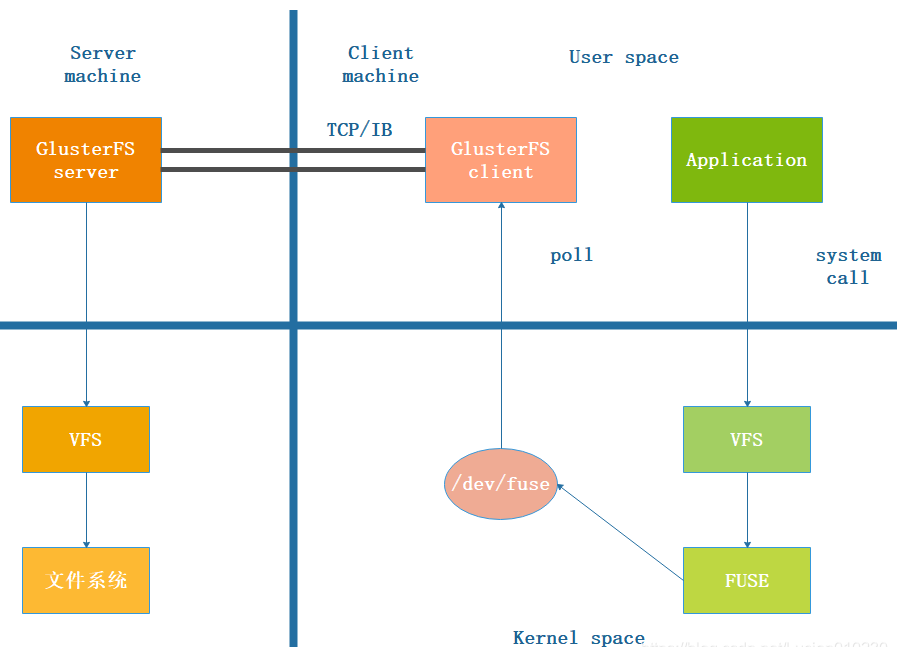 - FUSE将数据交给内存的/dev/fuse,然后递交到GFS客户端