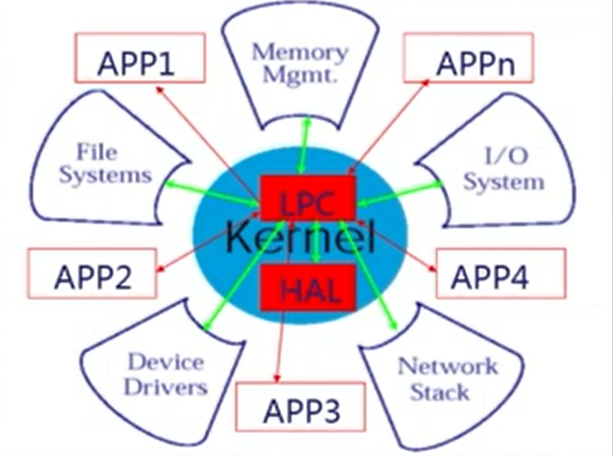 在操作系统内核之中只放最基本的功能,比如中断处理,消息传递等,像文件系统,内存管理,网络协议栈这些功能放在外围,以进程或者程序的服务形式存在,这些服务之间通过内核的消息传递机制来进行通讯,这是一种松、耦合的架构,通过合理的内存隔离,不同的服务之间互不影响。但这种微内核的架构会导致计算机运行的性能下降,以为需要通过内核来进行二次转换,相比于直接将文件系统等功能放在内核来说,性能肯定要下降。