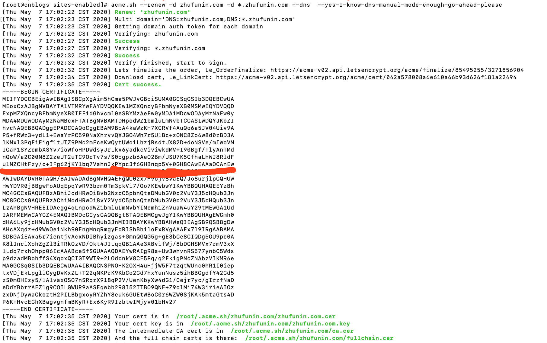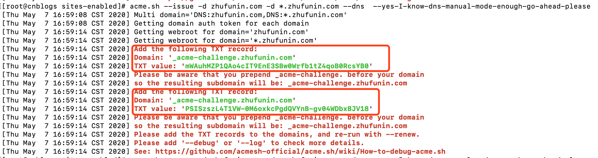acme.sh --renew -d zhufunin.com -d *.zhufunin.com --dns --yes-I-know-dns-manual-mode-enough-go-ahead-please