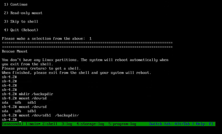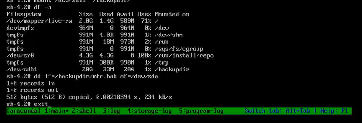 方法二:进入急救模式,恢复GRUB引导程序 NBR位于第一块硬盘(/dev/sda)的第一个物理扇区处,总共512字节,前446字节是主引导记录,分区表保存在NBR扇区中的第447-510字节中。 mkdir / bak mount /dev / sdb1 /bak dd if=/dev / sda of=/bak/ grub.bak bs=446 count=1 #模拟对MRB中的GRUB引导程序的破坏,但并不破坏分区表 dd if=/dev / zero of=/ dev /sda bs=446 count=1 #引导界面进入急救模式,从备份文件中恢复GRUB引导程序N sh-4.2# mkdir / backupdir sh-4.2#mount /dev / sdb1 /backupdir sh-4.2#dd if=/backupdir/grub.bak of=/dev / sda sh-4.2# exit