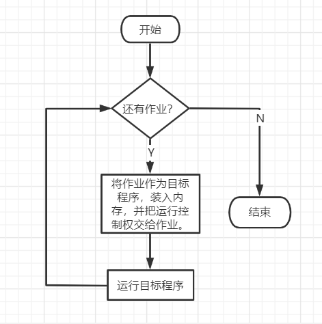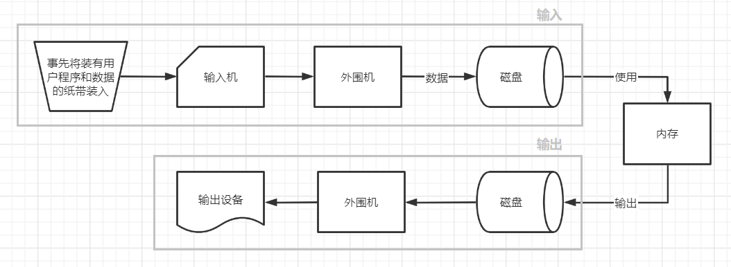 · 人工操作方式:程序员使用纸带传输程序和数据(用户独占全机、CPU等待人工操作) · 脱机输入/输出方式:需要时才从磁盘调入(减少CPU空闲时间、提高I/O速度)  - 单道批处理系统:先把一批作业以脱机的方式输入到磁带上,并配上监控程序控制作业能一个接一个的连续处理。(内存中仅有一道程序,系统资源仍然得不到充分利用)