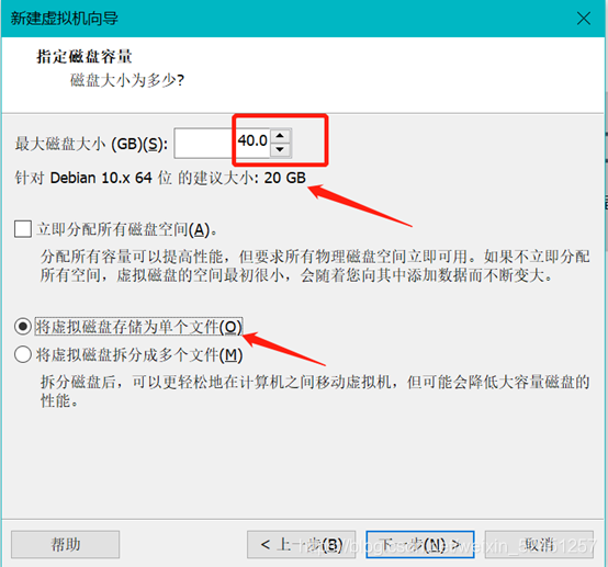 - 安装磁盘空间的话给40GB,将虚拟磁盘存储为单个文件。