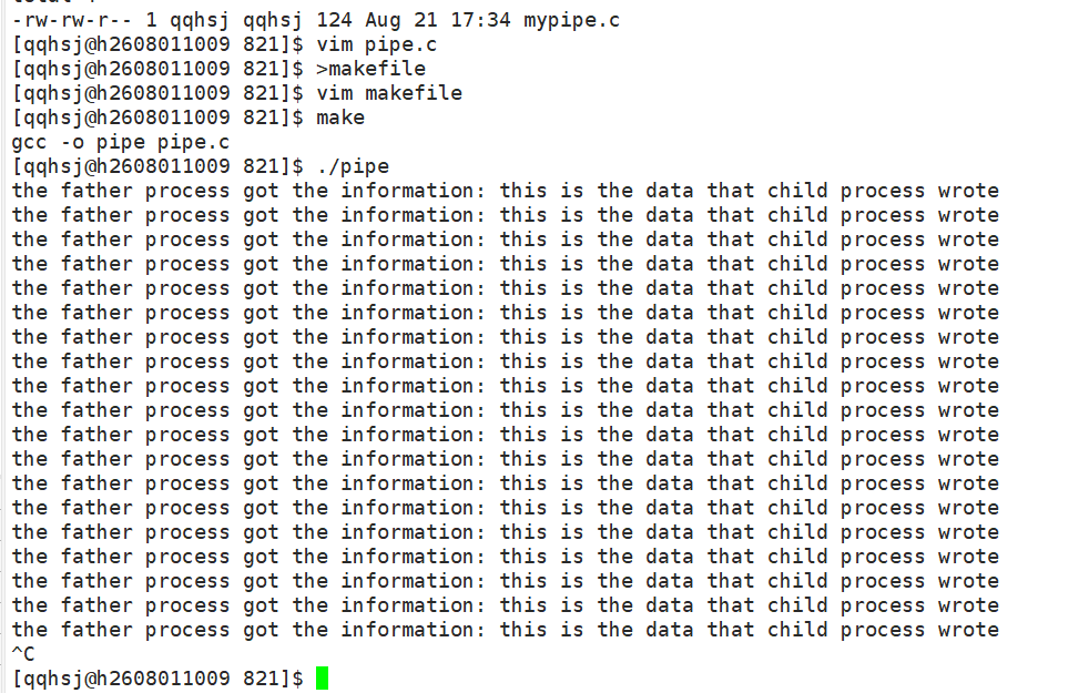 为了观察方便,对父子进程都是用死循环。子进程每隔一秒读入一段信息this is the data that the child process wrote用来证明子进程写入了数据;对于父进程则取读取数据,一旦读完数据,就输出the father process got the information,用来证明父进程读取到了数据