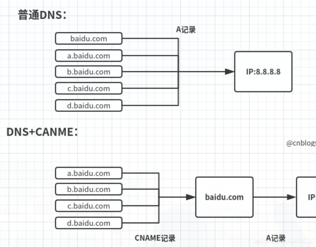 假如你是DD公司老板,你公司中的一台IP为1.1.1.1的服务器,注册了域名为www.dd.com,要对外提供客户访问。随着公司越做越大,访问量也越来越多,服务器顶不住了,你去找CDN提供商购买CDN加速服务,这个时候他们要求你的域名做个CNAME指向他们给你的一个域名叫www.dd.cdn.com