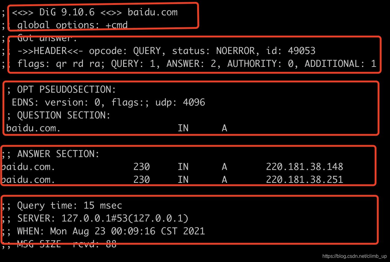 ?dig 命令默认的输出信息比较丰富,大概可以分为 5 个部分。 第一部分显示 dig 命令的版本和输入的参数。 第二部分显示服务返回的一些技术详情,比较重要的是 status。如果 status 的值为 NOERROR 则说明本次查询成功结束。 第三部分中的 “QUESTION SECTION” 显示我们要查询的域名。 第四部分的 “ANSWER SECTION” 是查询到的结果。 第五部分则是本次查询的一些统计信息,比如用了多长时间,查询了哪个 DNS 服务器,在什么时间进行的查询等等。