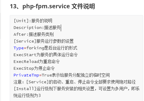 步骤:vim /lib/systemd/system/php-fpm.service 创建个文件 输入一些内容 [Unit] Description=php-fpm After=network.target [Service] Type=forking ExecStart=/usr/local/php7/sbin/php-fpm ExecStop=/bin/pkill -9 php-fpm PrivateTmp=true [Install] WantedBy=multi-user.target  步骤:重载 systemctl 配置 systemctl daemon-reload 重新载入