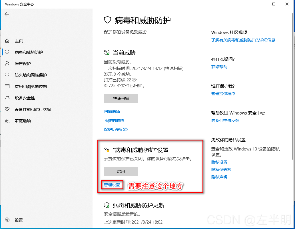 ?7、需要尤其注意的一点,在病毒和威胁防护中的病毒和威胁防护设置,点击管理设置